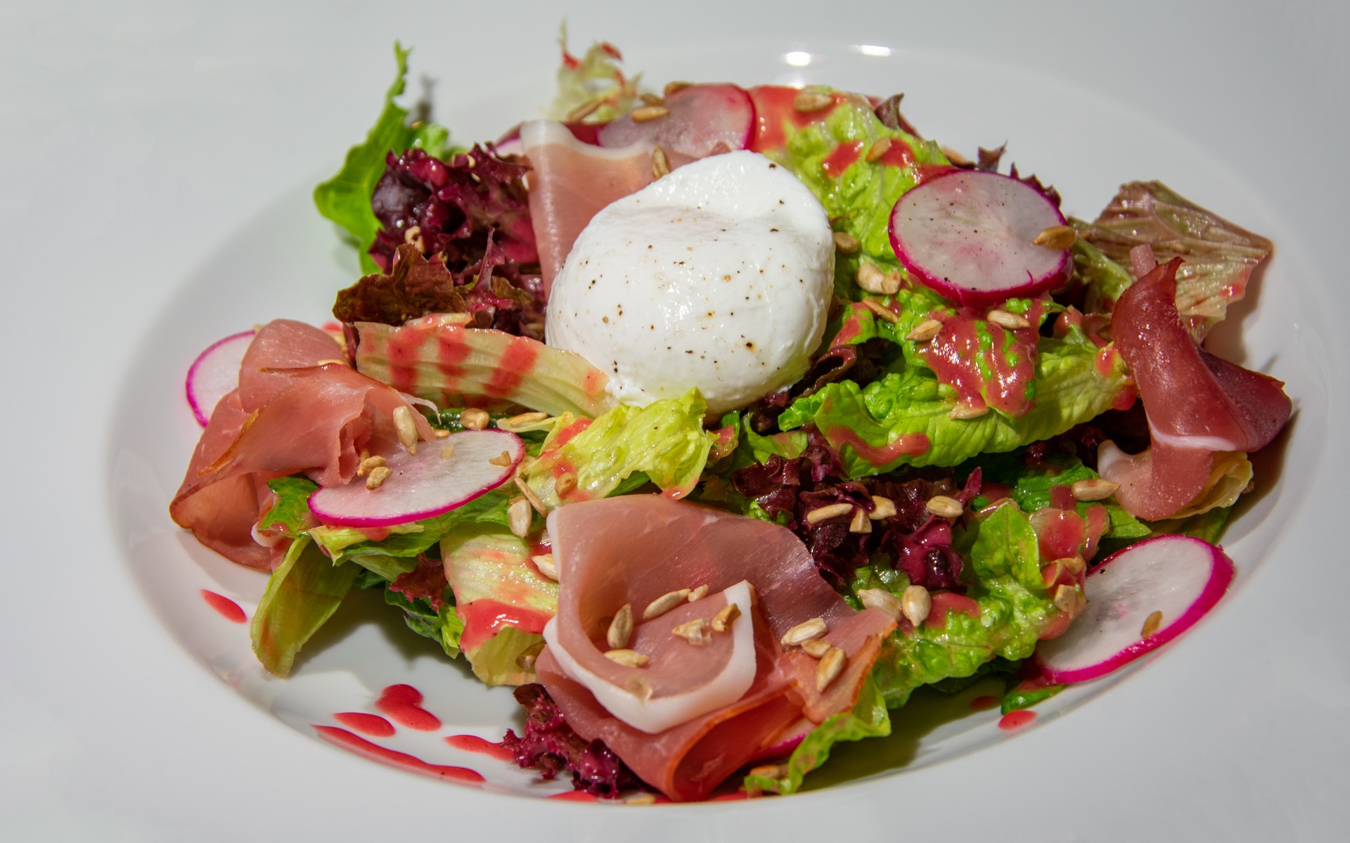 s uzenou krkovičkou, baby špenátem, nakládanou cibulkou a dresinkem z hořčice a bílého jogurtu